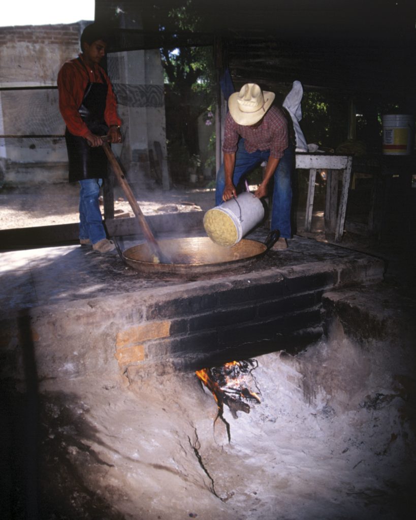 Mientras tanto en el gran cazo de cobre se prepara el almíbar; éste se hace con saco y medio de azúcar y un poco de agua, se pone a fuego con leña de mezquite hasta que inicia el hervor, se espesa y toma una coloración café, se le agrega la masa del membrillo molido; para cada cazo se emplean aproximadamente seis javas o cajas de membrillo.